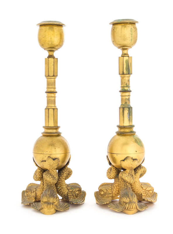 each having a knopped and faceted stem terminating in a spherical base set on stylized dolphin form supports.