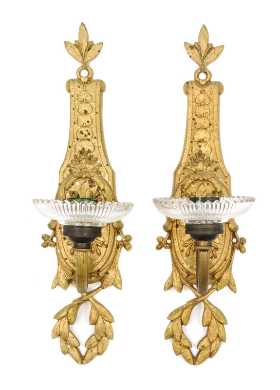 each having a foliate finial above the shaped backplate, issuing the scrolling candle arm.