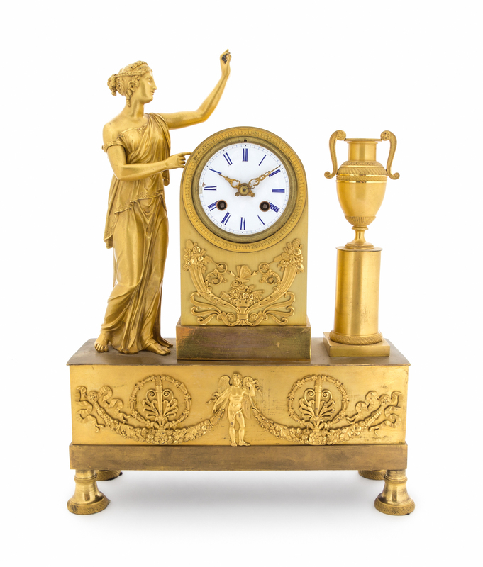 the domed case inset with a circular enameled dial with Roman numeral hours flanked by a classically draped maiden and a handled urn atop a columnar plinth, set on a rectangular base mounted with an angel flanked by torches and suspending ribbon tied floral swags, terminating in flared feet.