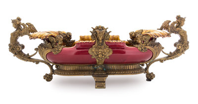 each end with a monoped handle cast to show a winged female warrior terminating in a claw and ball foot, the centerpiece bowl of elongated oval form with an everted foliate rim, mounted throughout to show ram and cherub masks, with impressed Majolica Sarreguemines and CC marks to the underside.
