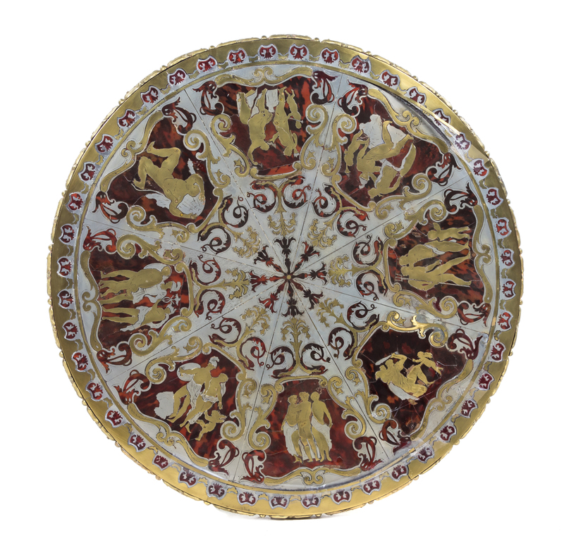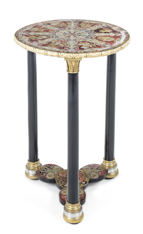 the radially segmented circular top having shaped reserves inlaid to show various classical figural scenes among foliate scrolls, raised on three Corinthian columnar supports joined by a similarly inlaid tripartite stretcher.