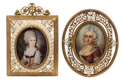 each of oval form and painted to depict a lady, one example signed Doffinger, the other signed Hau, set in gilt metal filigree frames.