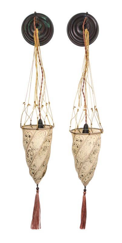 each circular backplate suspending the twisted conical silk shade ending in a tassel, marked Venetia Stadium and Made in Italy to the top of the shade.