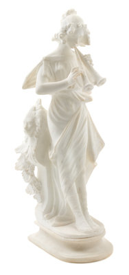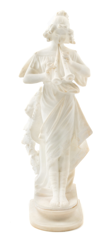 depicting a classically draped maiden playing horns, raised on a molded shaped plinth.