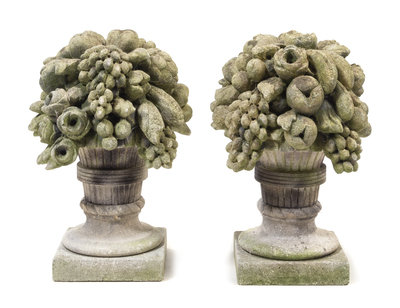 A Pair of Cast Stone Garden Models of Fruit-Filled Urns