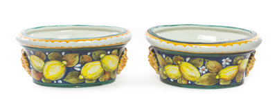 each of oval form with a grotesque mask at each end, painted to depict lemons among leaves and flowers.