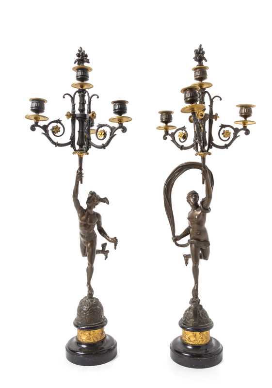in the form of Hermes and a draped female nude holding a torch issuing the four foliate scroll candle arms, each raised on a domed circular foot with a continuous band worked to show cherubs engaged in various pursuits.