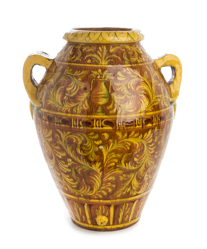 of handled ovoid form, painted on each side to show a handled urn among graduated horizontal bands enclosing foliate scrolls.
