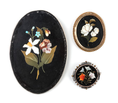 each having a slate ground with polychrome floral motifs, mounted as a brooch.