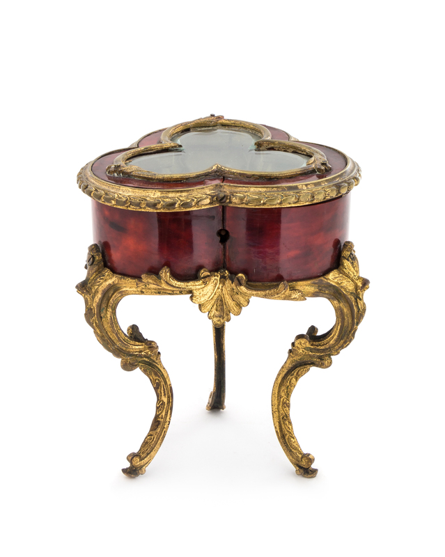 of trefoil form, the hinged lid inset with beveled glass and opening to a fabric lined interior, the conforming case raised on legs cast to show foliate scrolls.