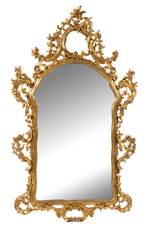 the openwork crest carved to show C-scrolls, flowers and rocaille above the shaped vertical mirror plate within a similarly carved conforming frame.