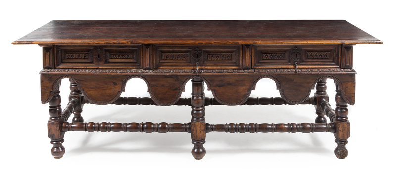 having a rectangular top above the frieze fitted with three paneled drawers carved to show repeating foliate decoration over the scalloped skirt with a carved edge, raised on turned legs joined by similarly worked stretchers and ending in flattened ball feet.