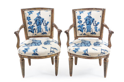 the straight channel molded crest rail above the padded back and stuffover seat within open arms, raised on square fluted tapering legs.
