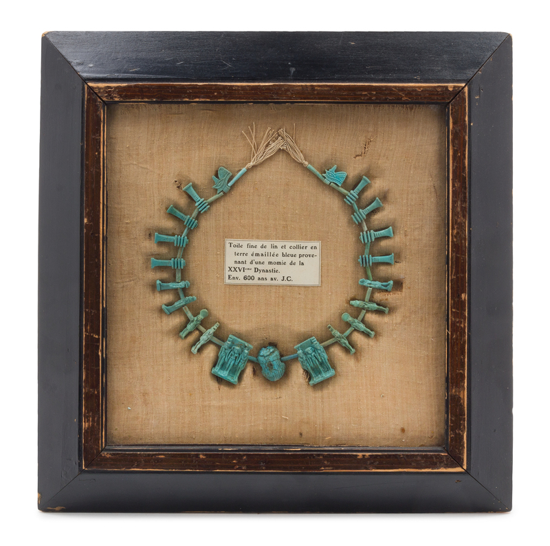 comprising twenty-one beads of various forms, framed with a note in French reading "Fine linen cloth and blue mesh cluster from a mummy of the XXVI dynasty approximately 600 years before J.C."