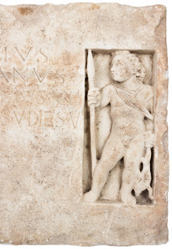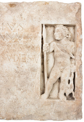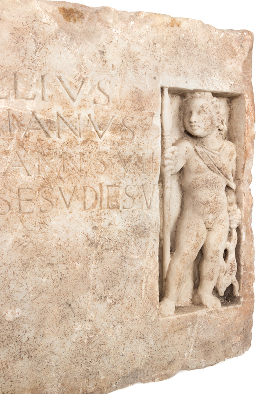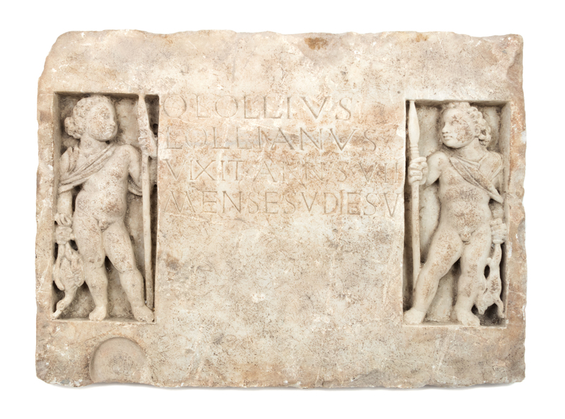 with a four-line inscription in Latin framed by two standing nude Cupids, their heads turned in toward each other, with deeply-drilled curling locks, an upright spear held in one hand, an animal offering in the other, one with a duck, the other with a rabbit, the inscription reading Q. Lollius Lollianus lived 7 years, 5 months, 5 days.