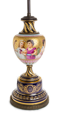 painted to show a continuous band of children engaged in various pursuits, raised on a circular foot above a stepped cylindrical plinth.