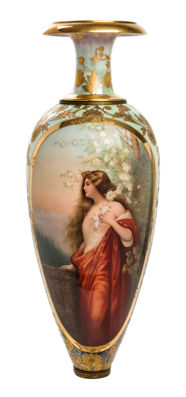 Erbluht, of elongated oval form with a flared rim, the central reserve painted to depict a maiden in a landscape, signed Wagner, against a pale green and cobalt iridescent ground with allover gilt floral highlights, raised on a domed circular foot titled and marked Dec: 179/ Depose to the underside.