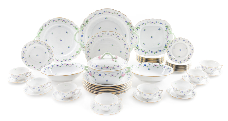 in the Blue Garland pattern, comprising a covered vegetable dish, two oval vegetable dishes, 8 dinner plates, 8 salad plates, 8 bread and butter plates, 8 teacups, 8 saucers, a handled cake plate and two circular handled serving dishes; 46 items total.
