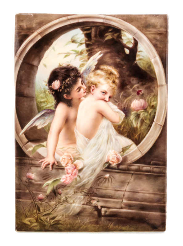 of vertical rectangular form, painted to depict a female cherub and a young girl seated in a forest landscape, with an impressed K.P.M. scepter mark and various other impressed marks to the reverse.