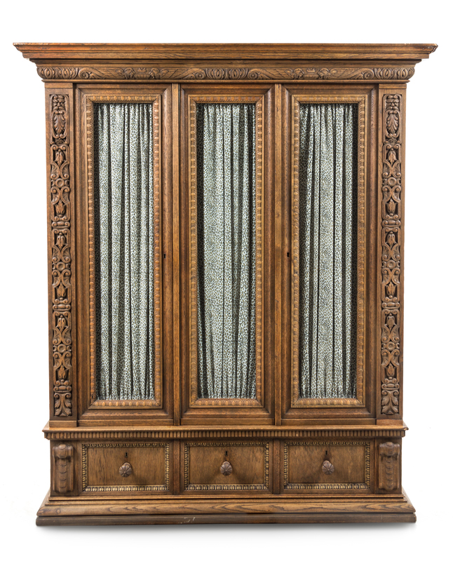 the molded projecting cornice above the frieze carved to show opposing winged lions and acanthus decoration, over three glazed paneled doors with carved egg-and-dart borders opening to an interior fitted for shelves and three aligned short drawers, raised on a molded plinth.