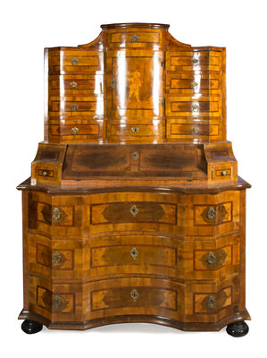 in three parts, the superstructure centered by a door and drawer of convex outline flanked on each side by a bank of four drawers of convex outline, the door inlaid to depict a musician, above a slant-front opening to a fitted interior and flanked by two short drawers, the conforming base fitted with three long drawers, raised on flattened bun feet.