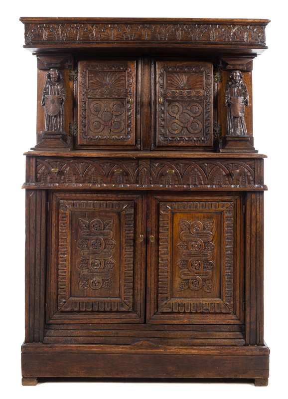 having a molded cornice and repeating foliate carved frieze above two paneled doors carved to show scrolled decoration flanked on each side by a draped male figure holding a shield, the lower case fitted with two drawers above two heavily carved paneled doors, raised on a bracket base.