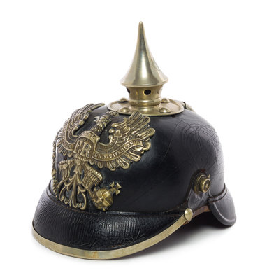 the helmet plate in the form of a Prussian eagle holding a scepter and Reichsapfel in its talons, the spreadwing body bearing the motto Mit Gott fur Koenig und Vaterland.