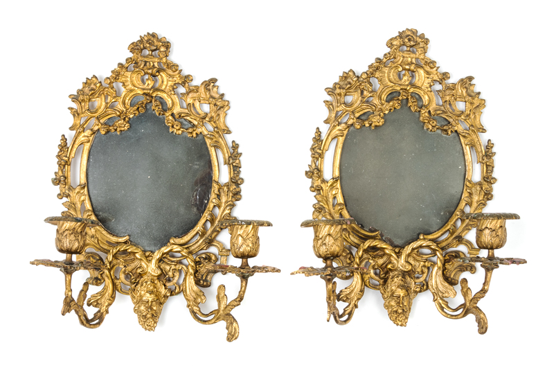 the pierced backplate cast to show a flowering urn above C-scrolls, rocaille, and floral garlands, the shaped oval mirror plate above a satyr mask issuing the two scrolling candle arms.