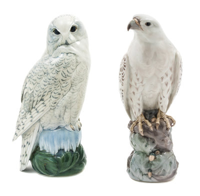 models 1661 and 1829, depicting an Icelandic falcon and a Snowy owl, respectively, the falcon modeled by Peter Herold and signed Herold, each with blue waves marks in underglaze blue and various painted and impressed marks to the underside.