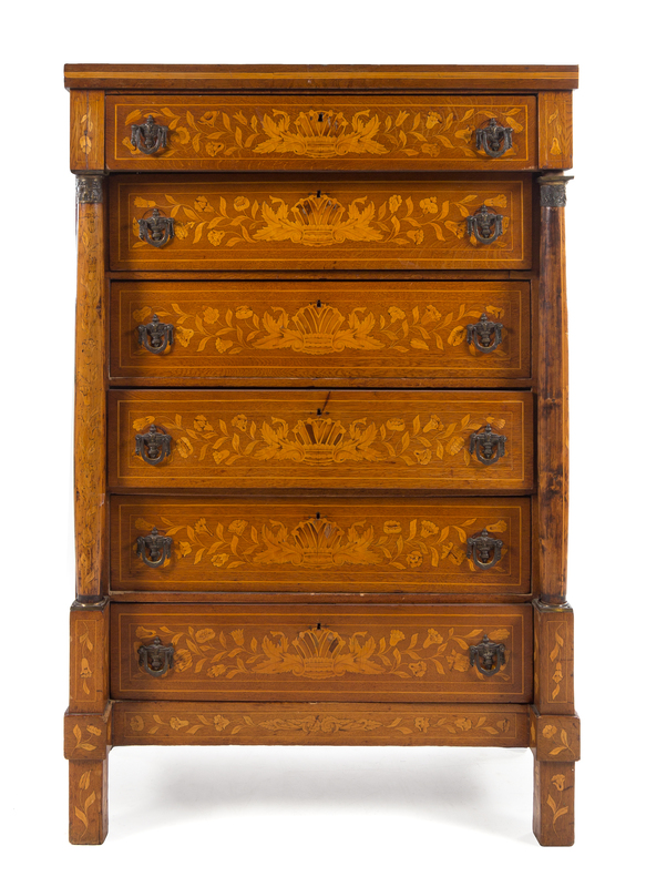 the rectangular top above a frieze drawer and five long drawers flanked by tapering columnar pilasters, the whole raised on block feet, inlaid throughout to show flowering vines.