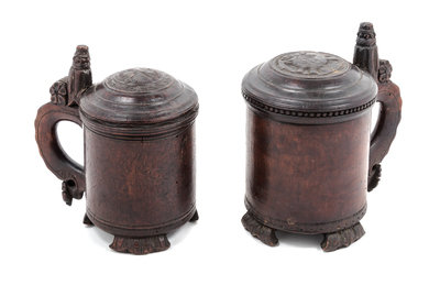 each having a domed hinged cover and a heavily carved thumb-piece and handle, the cylindrical body raised on foliate carved feet.