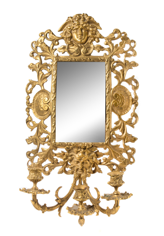 the vertical rectangular mirror plate within an openwork frame centered with a mask among foliate scrolls and shells, the male mask terminal issuing the three foliate scroll candle arms.