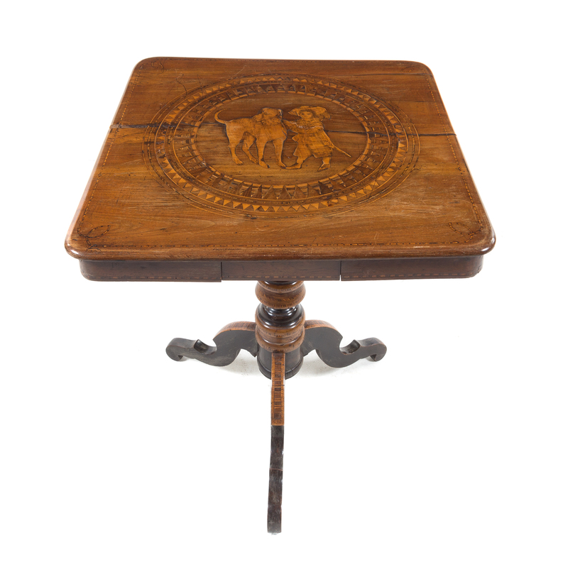 the square top with rounded corners inlaid to show a child and a dog within a circular reserve having repeating geometric decoration, raised on a turned standard ending in a tripod base.