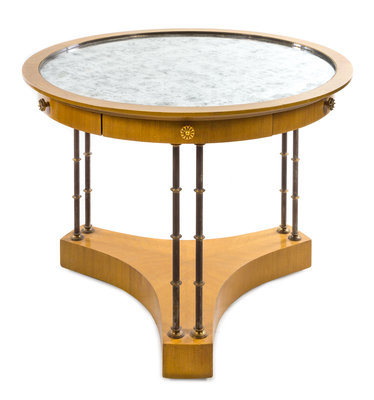 the circular top with an inset mirrored surface above a series of four drawers and two sliding playing surfaces, raised on ring turned cylindrical supports joined by a tripartite base ending in casters.