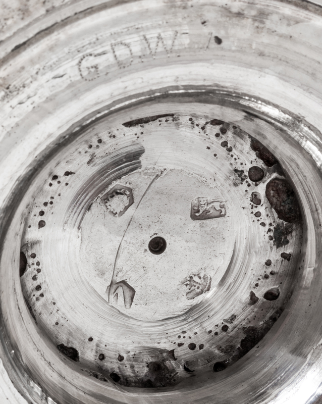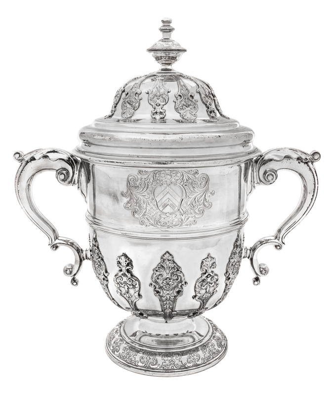 the domed cover having a knopped finial and foliate and volute strapwork, the bell shaped body with acanthus capped S-scroll handles and engraved on one side with a coat-of-arms, the lower body with similar strapwork decoration, raised on a stepped circular foot.