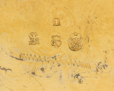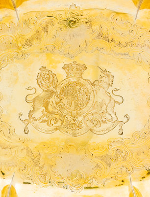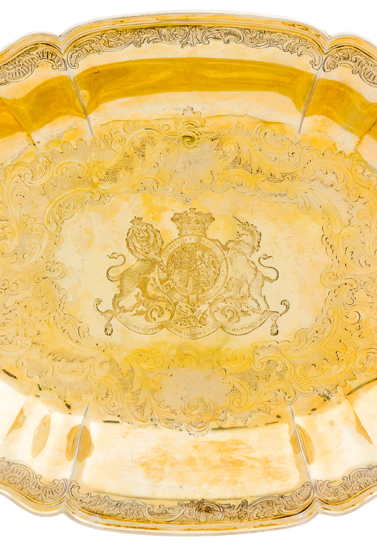 of oval form, the undulating rim chased with floral and volute decoration, the base worked to show foliate and C-scroll motifs centered with the English Royal Coat of Arms for Prince Augustus Frederick (1773-1843), Duke of Sussex.