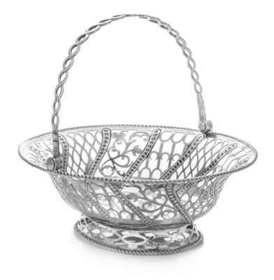 the swiveling double-helix handle above the openwork body worked to show vines and beaded decoration, raised on a conforming oval foot.