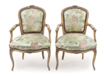 each having a domed floral carved crest rail above the padded back, arms and stuffover seat, raised on floral carved cabriole legs.