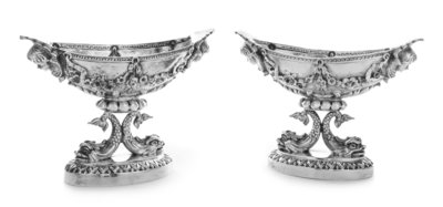 each bowl of oval form with putto mask handles, the body worked to show repousse floral festoons, raised on an addorsed dolphin base with foliate banding.
