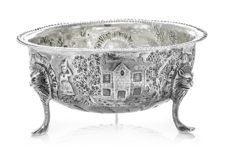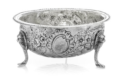 the beaded rim above the body having repousse pastoral scenes and a vacant cartouche, raised on paw feet headed by lion masks.