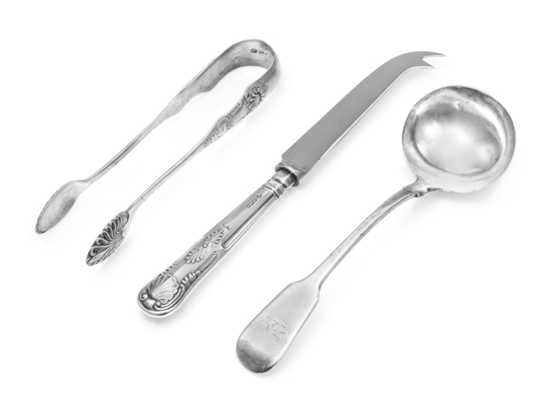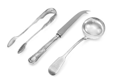 comprising a George IV silver sauce ladle, William Chawner II, London, 1825; a Scottish Victorian silver sugar tongs, George Edward & Son, Glasgow, 1865 and a bar knife, Nat Leslie Ltd., Sheffield, 1988.