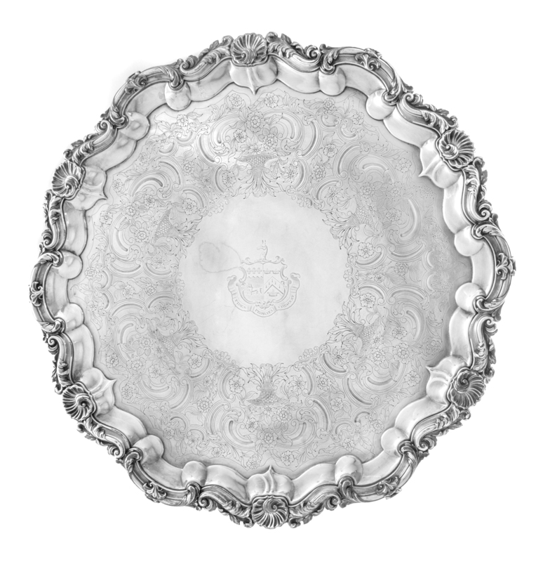 the rim worked to show rocaille and C-scroll motifs, the field centered with an engraved coat-of-arms among volutes and floral and foliate decoration.