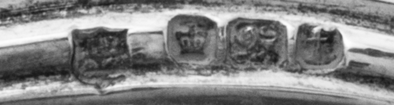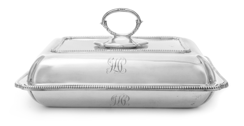 of rectangular form with gadroon banding to the lid and rim, the lid engraved with a monogram.