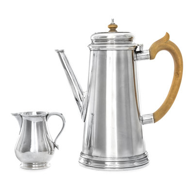 the coffee pot of tapering cylindrical form, the creamer of baluster form with a scroll handle.