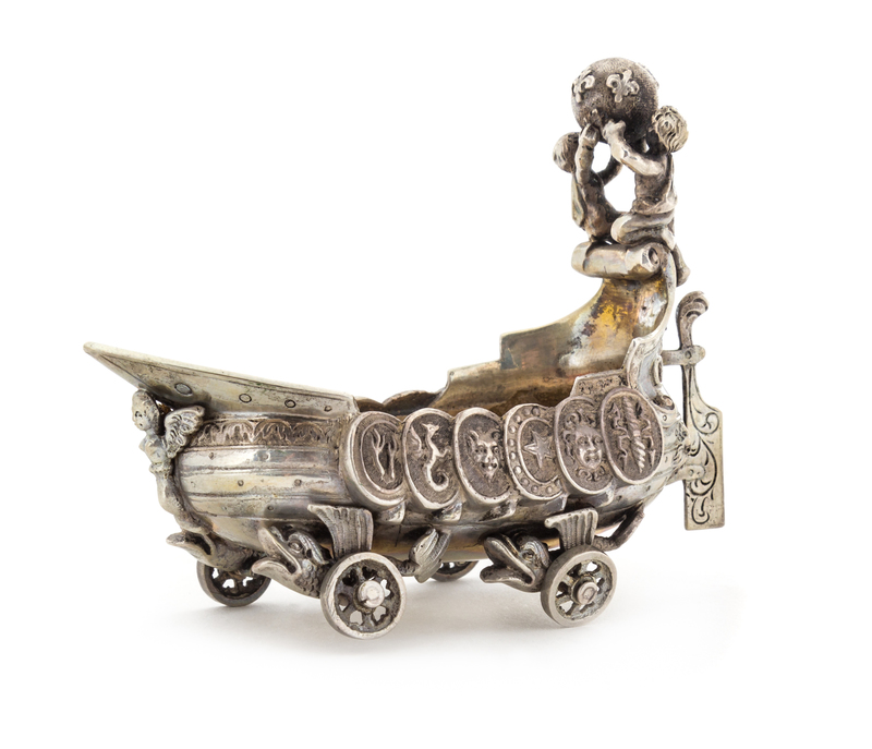 the stern surmounted by two putti hoisting a globe worked to show fleurs-de-lis, the hull decorated with shields and having dolphin-form figures on the keel supporting the wheels.