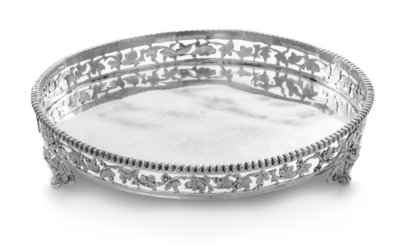 having a beaded rim and an openwork gallery worked to show grape clusters and vines, raised on volute feet.
