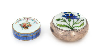 comprising a French example, the lid decorated with a floral spray and ribbon motifs on a guilloche ground, together with a Continental example having a polychrome thistle motif on a guilloche ground, the interior with English export marks.