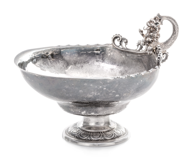 the Merlion handle above the rim having openwork volute and beaded decoration, raised on a circular foot.