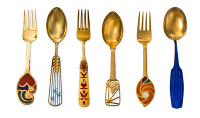 Fourteen Danish Silver-Gilt and Enamel Christmas Spoons and Forks