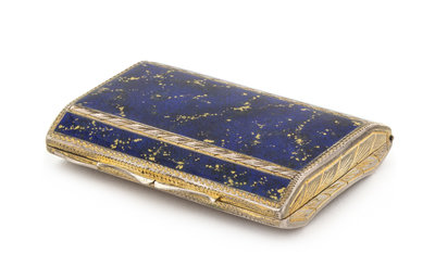 the lid worked with faux lapis enameled decoration, the underside chased with floral and volute motifs.
